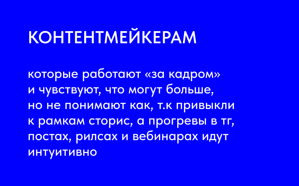 которые работают «за кадром» и чувствуют, что могут больше, но не понимают как, т.к. привыкли к рамкам сторис, а прогревы в Telegram, постах, рилсах и вебинарах идут интуитивно